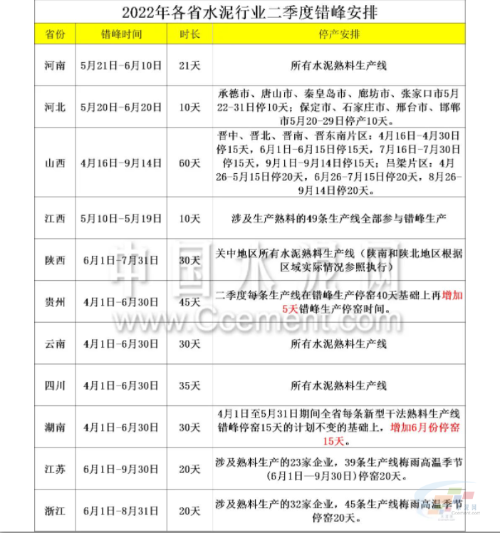 據中國水泥網消息,河南省預計從5月21日起至6月10日停窯21天;山西晉中、晉北、晉南、晉東南片區6月1日到7月30日停產30天,呂梁片區6月26日至7月15日停產20天;河北省水泥熟料企業5月20日至6月10日,分區域自律錯峰停產10天……