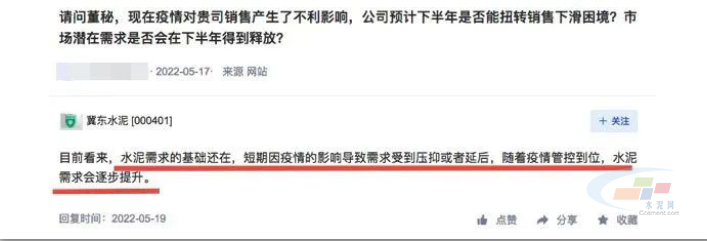 多家水泥企業也對后市傳遞出信心,如冀東水泥在回應投資者時表示,受疫反復、多發的情影響,目前公司水泥和熟料綜合銷量較去年同期下降。但目前看來,水泥需求的基礎還在,短期因疫情的影響導致需求受到壓抑或者延后,隨著疫情管控到位,水泥需求會逐步提升。