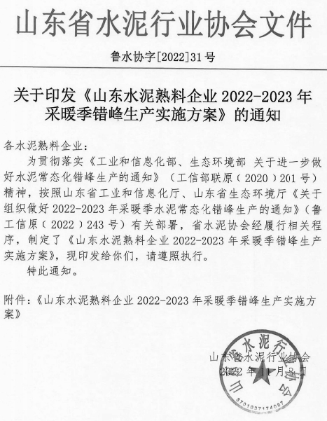 11月8日,山東省工業和信息化廳,生態環境廳發布《山東省工業和信息化廳山東省生態環境廳關于組織做好2022-2023年采暖季水泥常態化錯峰生產的通知》(魯工信原[2022]243號),《通知》中要求全省水泥熟料企業的所有熟料生產線(含特種水泥熟料生產線)在2022年11月15日0:00-2023年3月15日24:00進行錯峰生產。