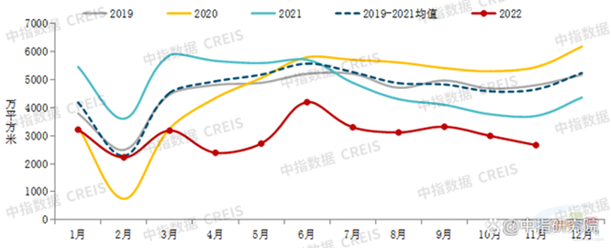新開工方面,2022年1-11月,房屋新開工面積111632萬平方米,下降38.9%。其中,住宅新開工面積81734萬平方米,下降39.5%。單月新開工面積自4月起連續7個月同比下降超35%。11月新開工面積環比下降,絕對規模處2022年以來月度最低水平。