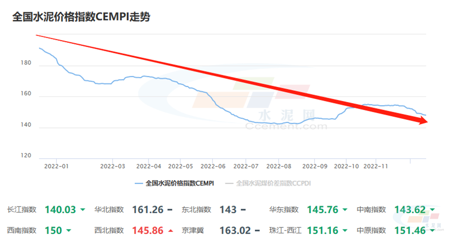 全國水泥價格指數來看,雖然在上半年和下半年各有小幅回升,但整體呈現下行態勢。截止到12月中旬,全國水泥價格指數CEMPI下跌43.32點,全國行情整體呈現“旺季不旺,淡季更淡”態勢。
