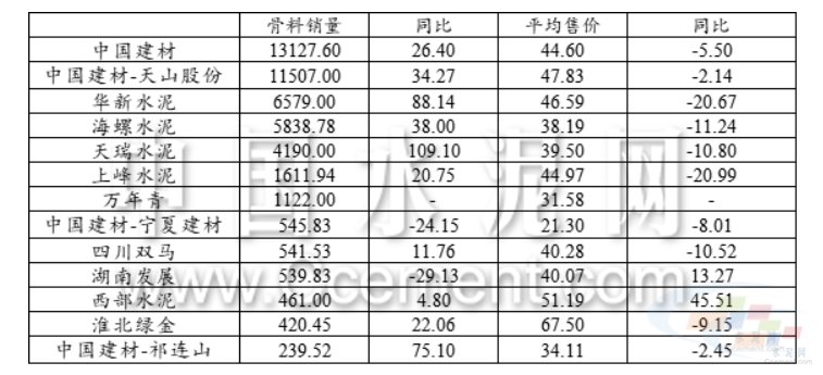 水泥大數據:2022年部分上市公司骨料價格及銷量情況(單位:萬噸,元/噸,%)