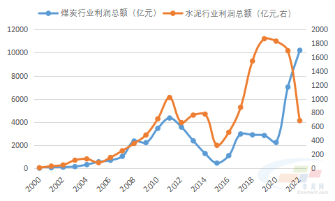 2000年,煤炭行業和水泥行業均剛剛實現扭虧為盈,煤炭行業實現利潤總額0.5億元,水泥行業實現利潤總額6.33億元,水泥行業利潤總額是煤炭行業的12.7倍。22年后,煤炭行業利潤總額已是水泥行業的14.9倍,令水泥行業望塵莫及。