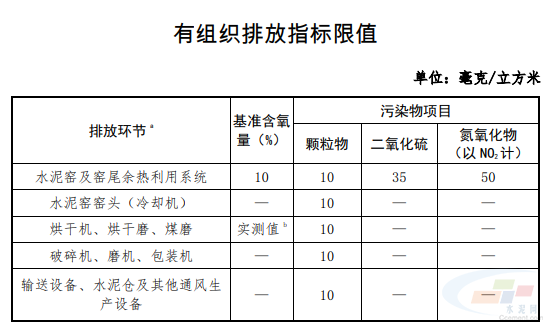 (一)有組織排放控制指標(biāo)。在基準(zhǔn)含氧量 10%的條件下,水泥 窯及窯尾余熱利用系統(tǒng)廢氣顆粒物、二氧化硫、氮氧化物排放濃度小時(shí)均值分別不高于 10mg/m3、35mg/m3、50mg/m3。其他有組織排放,氨等表中未作規(guī)定的按國(guó)家或地方標(biāo)準(zhǔn)執(zhí)行。達(dá)到超低排放的水泥企業(yè)每月生產(chǎn)時(shí)間至少 95%以上時(shí)段排放濃 度小時(shí)均值滿足上述要求。