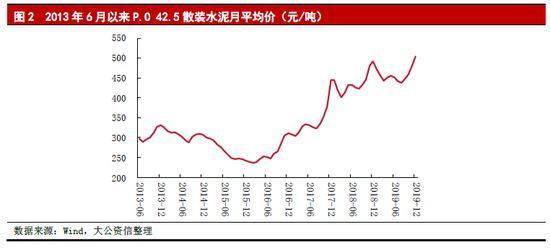 三季度起,由于夏季高溫多雨,加上南方部分區域臺風多發,水泥需求受到抑制,市場進入第二輪下跌行情。至8月中下旬,除華南地區價格始終處于下行狀態外,其他區域市場價格不同程度上漲。9月份國內水泥企業出貨逐步達到旺季水平,各地市場價格順勢加快上漲節奏。四季度進入冬季采暖期,錯峰生產重新啟動,環保持續加壓,《指導目錄》等去產能政策發布,水泥供給持續收緊,以廣東省為代表的水泥需求較大的華南地區甚至出現斷供情形,疊加運輸成本上升等多方因素的影響,水泥價格高速上漲。2019年12月,P.O42.5散裝水泥銷售均價為504.25元/噸,已突破近年來最高水平。
