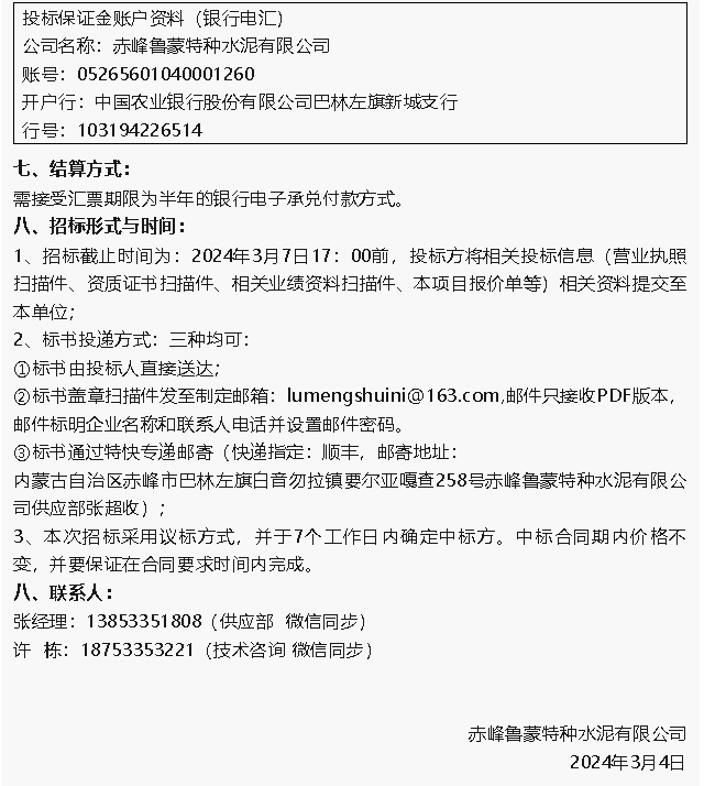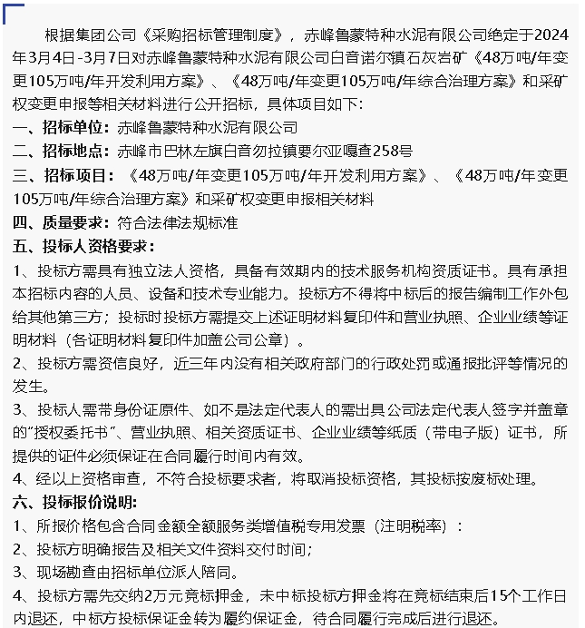 【招標公告】魯蒙水泥