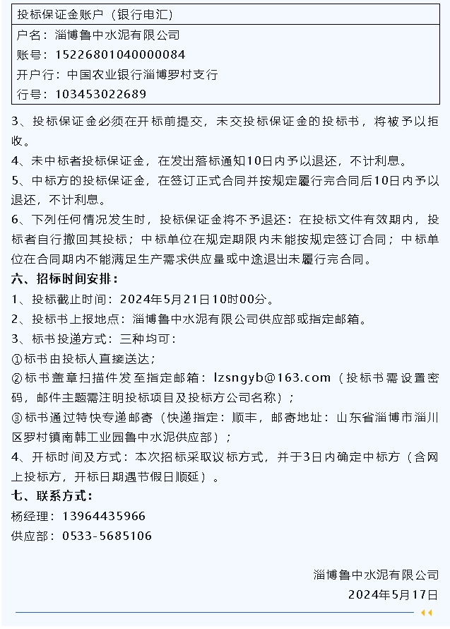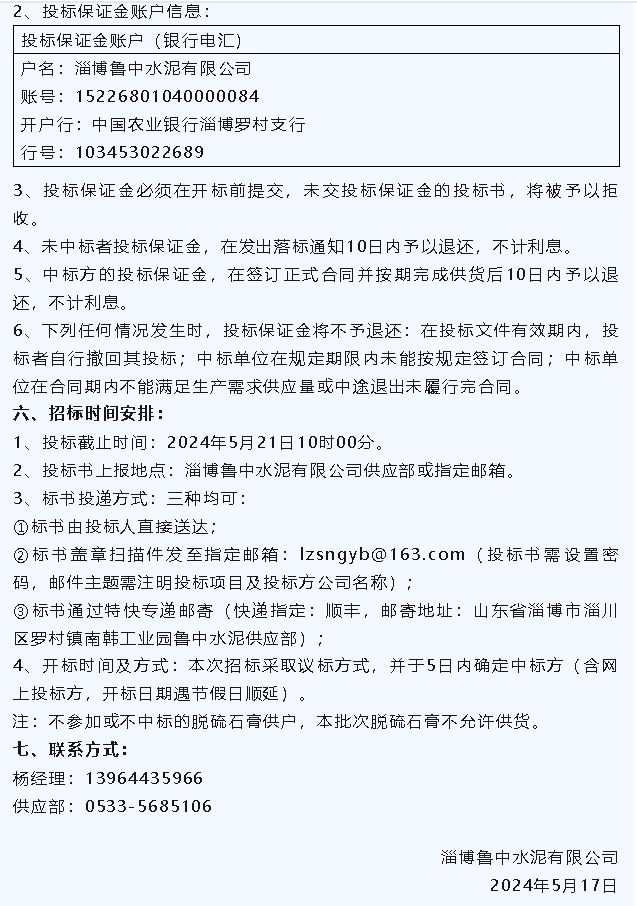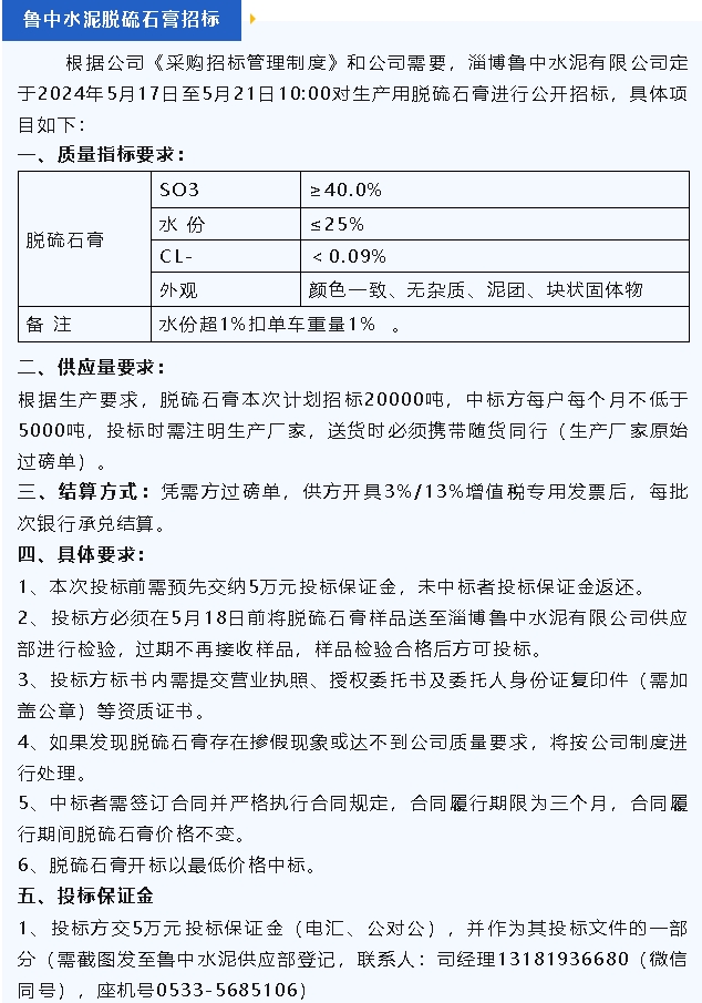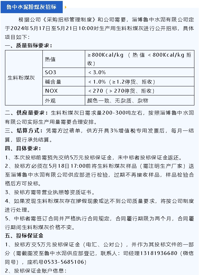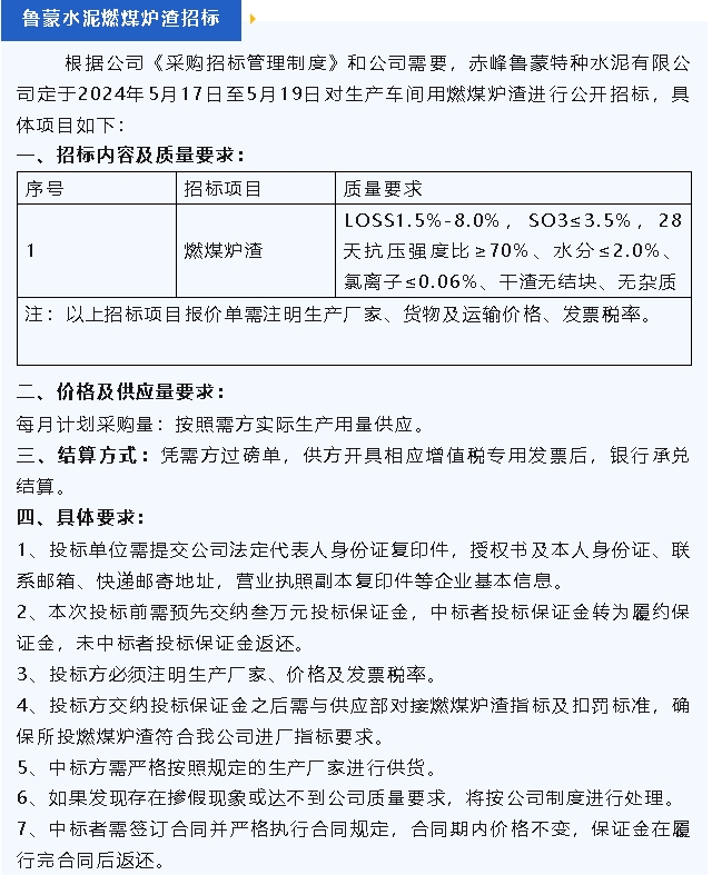 【招標公告】魯蒙水泥燃煤爐渣,魯中水泥粉煤灰、脫硫石膏招標
