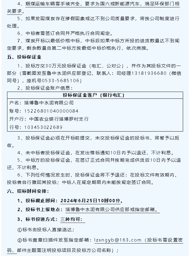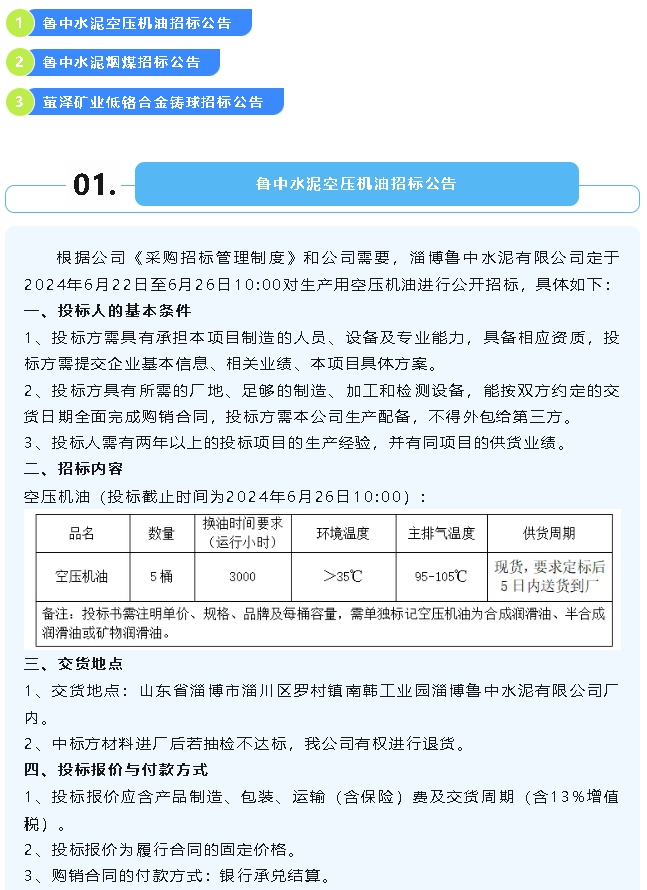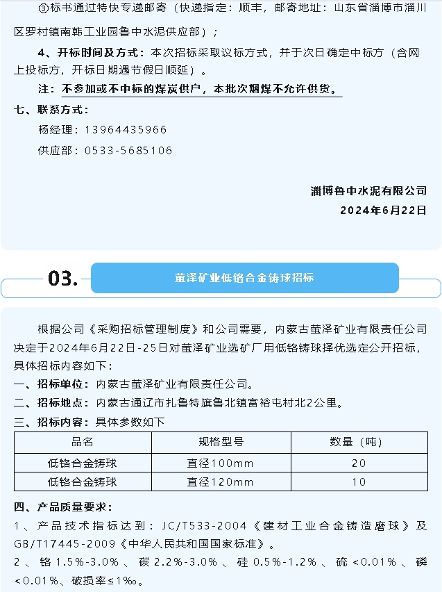 【招標公告】魯中水泥空壓機油、煙煤,螢澤礦業低鉻合金鑄球招標
