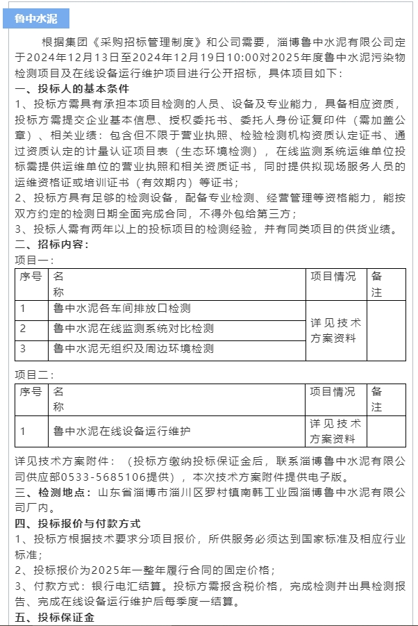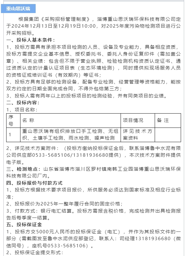 【招標公告】魯中水泥、重山思沃瑞